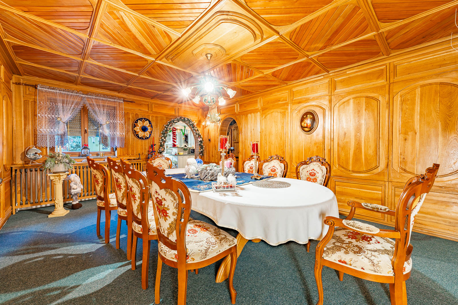 Interiéry pripomínajú sídlo ako zo seriálu Dallas – masívne drevo, veľké spoločenské miestnosti, dominantné schodisko, honosné salóny aj jedáleň s výraznou identitou. Každý priestor má vlastný príbeh a jasnú funkciu, čo je pri fotení takýchto nehnuteľností kľúčové správne vizuálne zachytiť.