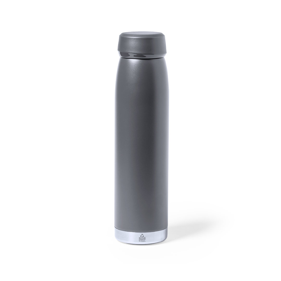 380ml capacity thermal bottle, made in recycled, double wall stainless steel, with matching screw cap and silver base. Available in a wide range of satin colours, BPA free and presented in an individual box in kraft design. Steel is one of the most demanded materials and can be found almost everywhere, from everyday products to major constructions. With countless properties, including durability and a high level of reusability, it is a much valued alternative for sustainable solutions. Properly treated, new resources of infinite use can be obtained.
