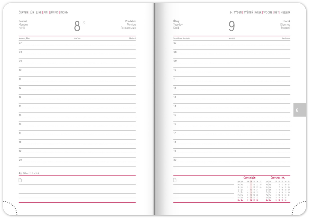 Denný diár Ajax 2026 v modrej farbe. Jemne štruktúrovaný povrch s atypickým reliéfom je vhodný pre všetky typy razieb. Diár má zaguľatené rohy, pútko na ceruzku a elastickú gumičku. Denný rozvrh s česko-slovenským kalendáriom a doplnkovou angličtinou, nemčinou, maďarčinou a ruštinou.