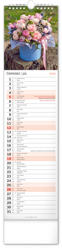 Okrasné kvety a kvetinové aranžmány na stránkach nástenného kalendára v praktickom kravatovom formáte, ktorý sa zmestí naozaj všade. V česko-slovenskom kalendári je rovnocenne zahrnutá čeština a slovenčina, české a slovenské mená, sviatky, pamätné dni aj mesačné fázy. V každom dni je priestor pre poznámky.