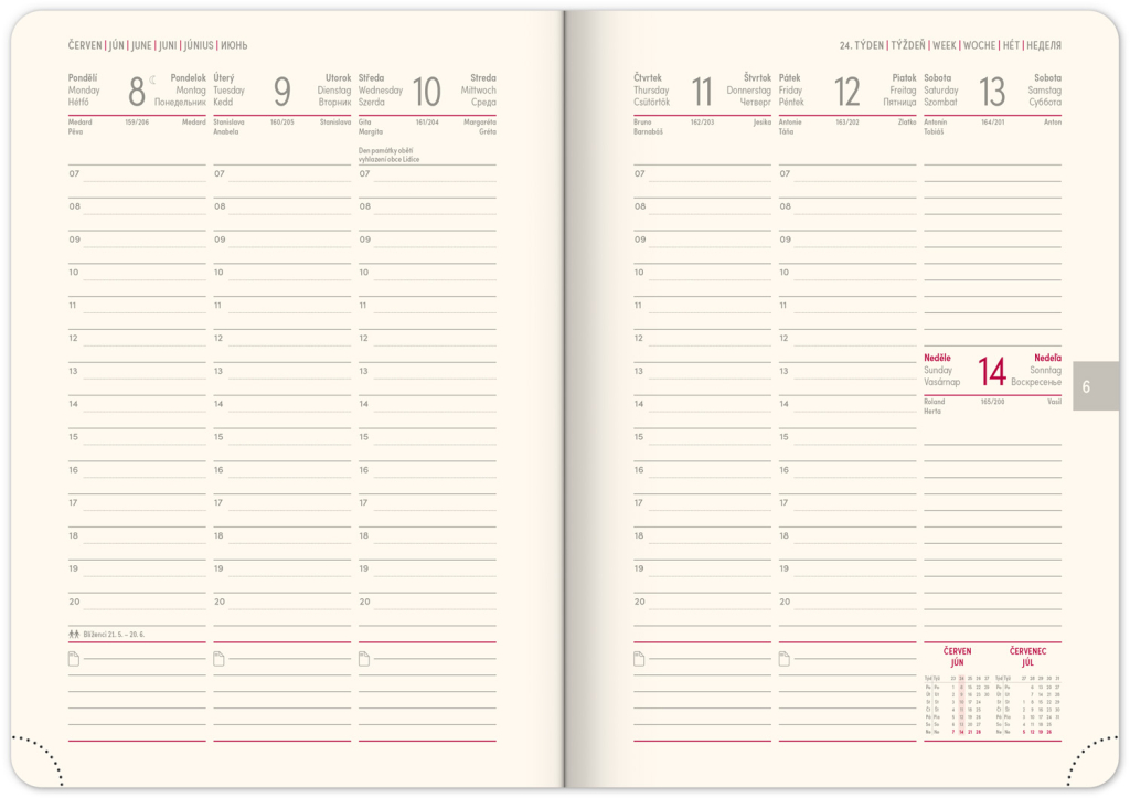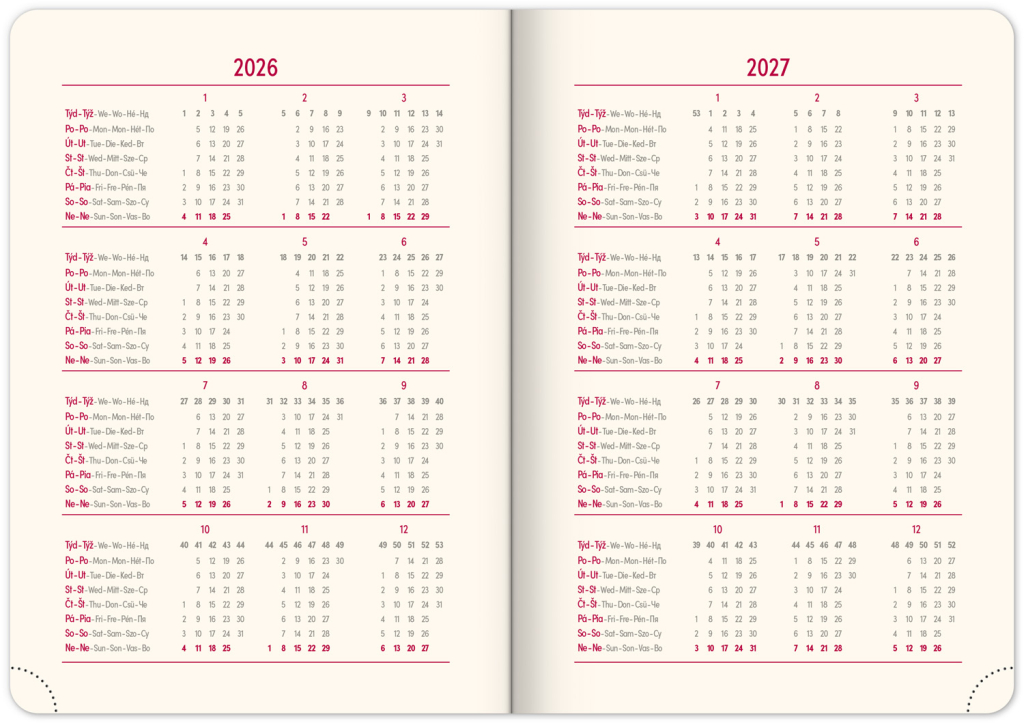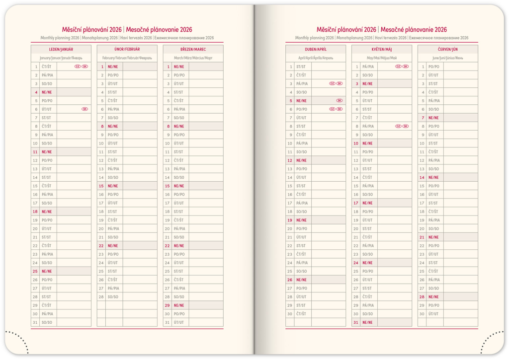 Týždenný diár Diamante 2026 v čiernej farbe. Povrch diára má jemnú štruktúru pripomínajúcu výbrus diamantu a je ideálny pre všetky typy razieb. Diár má zaguľatené rohy, pútko na ceruzku a elastickú gumičku. Týždenný rozvrh s česko-slovenským kalendáriom a doplnkovou angličtinou, nemčinou, maďarčinou a ruštinou.