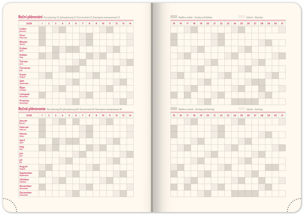Týždenný diár Twill 2026 v bordó-zlatej farbe. Dva povrchy spojené efektným lepením – jednofarebný materiál je doplnený metalickým povrchom s razbou letopočtu. Diár má zaguľatené rohy, pútko na ceruzku a elastickú gumičku. Týždenný rozvrh s česko-slovenským kalendáriom a doplnkovou angličtinou, nemčinou, maďarčinou a ruštinou.