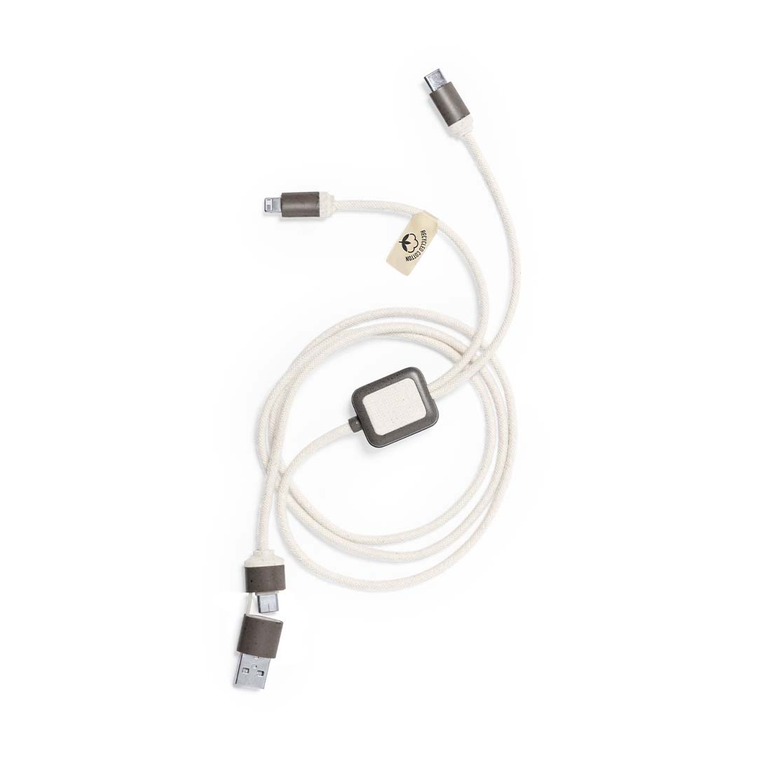 Charging cable made of coffee fibre, with cables covered in recycled cotton. Type C and USB input connections, with Type C, Lightning and Micro USB outputs. 5V DC 2.4A. With coffee fibre and recycled cotton logo. Presented in an individual kraft design self-seal bag.Coffee fibre is a circular solution that is obtained from the use of the waste produced in the production of coffee. A sustainable alternative that favours the reduction of the use of plastics, saving energy in its manufacturing process and contributing to the care of the environment. GRS (Global Recycled Standard) certification is available, which guarantees the recycled origin of the material used to manufacture the product.