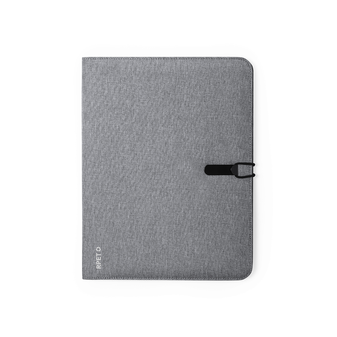Elegant nature line folder A4 size. Made of resistant 600D RPET, melange effect, made from recycled plastic to encourage the reuse of plastic waste and contribute to the sustainability of the planet. Black color details. Including elastic band, metal closure designed for laser printing. Inside with detachable 20-page notepad in striped layout, 3 flap pockets, card holders and pen holder. RPET distinctive in corner.