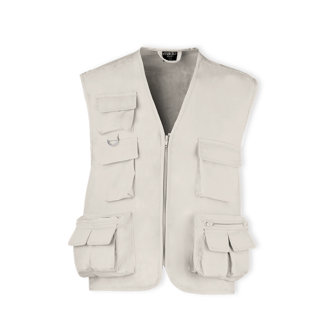Vest in resistant combination of cotton and polyester materials in bright tones. Main zipper closure, plenty of front and side pockets with large capacity and velcro closure and metal ring on the chest. Available in sizes L, XL, XXL.